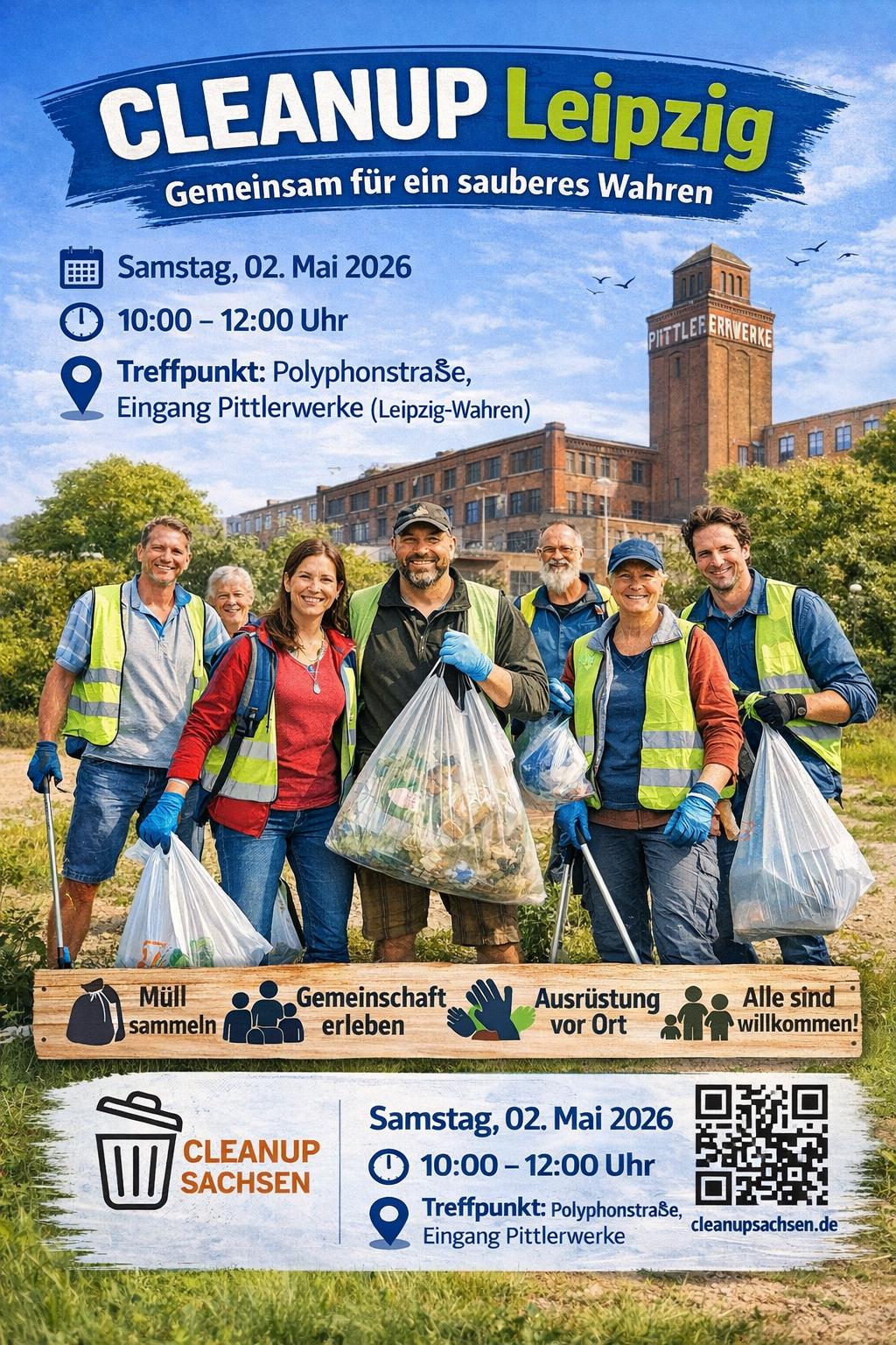 Polyphonstraße Eingang Pittlerwerk Wuest Polyphonstraße, Leipzig, Sachsen, GermanyCleanupCLEANUP Leipzig – Gemeinsam für ein sauberes Wahren 📅 Samstag, 02. Mai 2026🕙 10:00 – 12:00 Uhr📍 Treffpunkt: Polyphonstraße, Eingang Pittlerwerke (Leipzig-Wahren) Am 02. Mai laden wir euch herzlich zu einem gemeinsamen Cleanup im Leipziger Stadtteil Wahren ein. Rund um die historischen Pittlerwerke und die angrenzenden Flächen wollen wir aktiv werden und ein sichtbares Zeichen […]